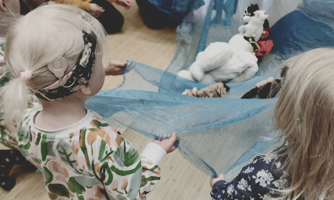 Kolme lasta lavan edessä. Kaksi kääntyneinä lavaa kohti, heillä on sisäkorvaistutteet. Kolmas lapsi katsoo ja osoittaa kuvan ulkopuolelle.